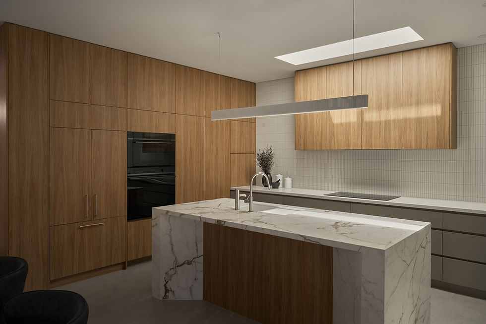 Warm oak cabinetry exudes understated refinement, while the porcelain island, with its striking veining, adds an element of opulence while remaining highly durable. Seamlessly integrated appliances and minimalist finishes enhance the contemporary aesthetic, creating a versatile and liveable environment suited to a growing family’s lifestyle.